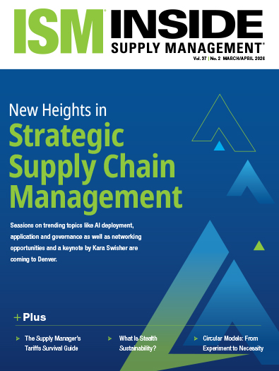 The March/April issue of Inside Supply Management® has timely and actionable insights from Institute for Supply Management® (ISM®). With costs and supply continuity top of mind after the U.S. Supreme Court’s ruling on emergency tariffs and hostilities in the Middle East after the U.S./Israeli strikes on Iran, a feature story highlights more than 20 strategies in a tariffs survival guide. Sustainability is a big theme in this issue, with features on companies’ “stealth” efforts and how circular supply chain models are moving from experimental to essential. And the cover story highlights the ISM World 2026 Annual Conference, which will offer an array of learnings and tools on pressing supply chain matters across the board — particularly AI.